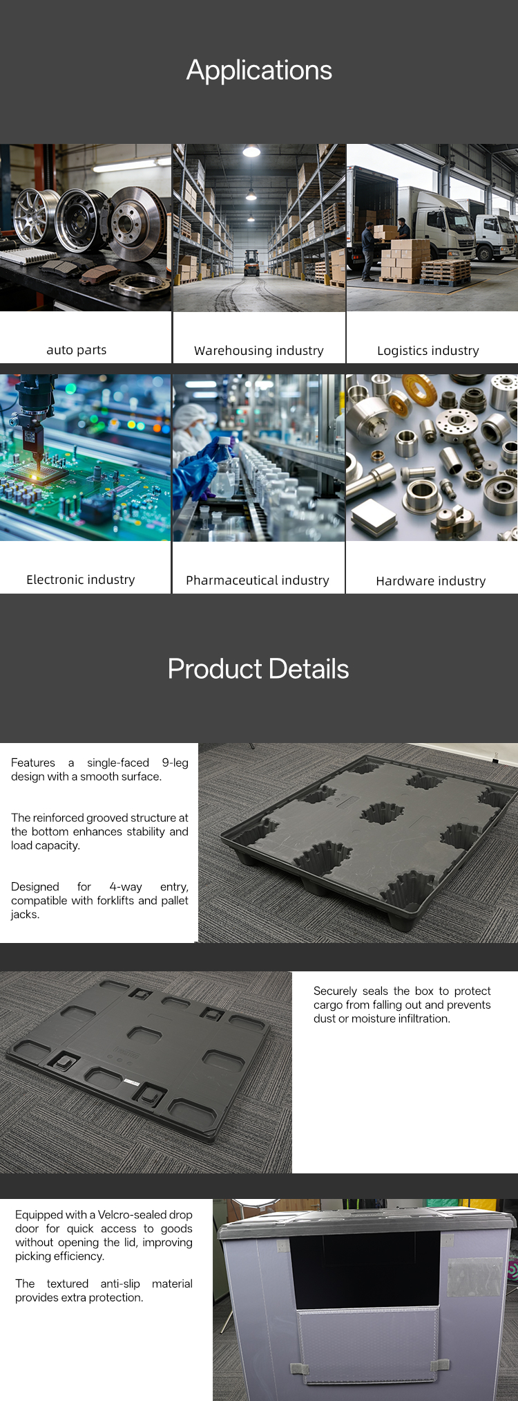 のために 精密電子機器および半導体産業 これらのパレットボックスは、安定した静電気防止環境を提供します。9本脚のベースに施された構造リブが輸送中の振動を最小限に抑え、壊れやすいPCBアセンブリやセンサーを保護します。また、防塵構造により、電子機器製造において高い歩留まりを維持するために不可欠な、微粒子が繊細な部品に侵入するのを防ぎます。